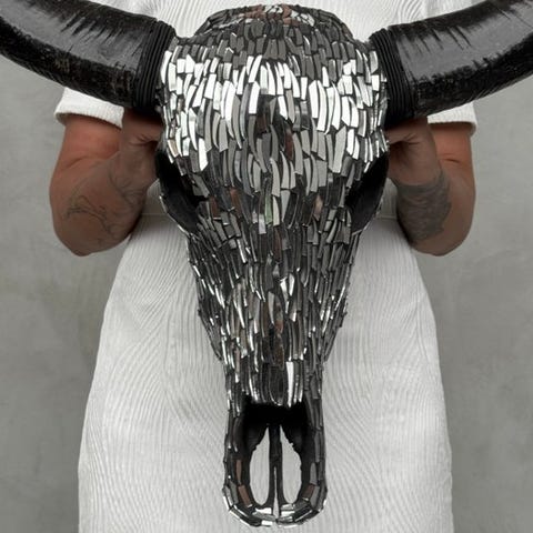 Suuri buffalokallo, joka on käsin kaiverrettu lahjakkaiden balilaisten käsityöläisten toimesta. Heidän isänsä ovat siirtäneet ikivanhan kaiverrustaidon pojilleen. Tämä kallo on täysin avattu kaiverrettu. Kaiverrus on poikkeuksellisen korkealaatuista.