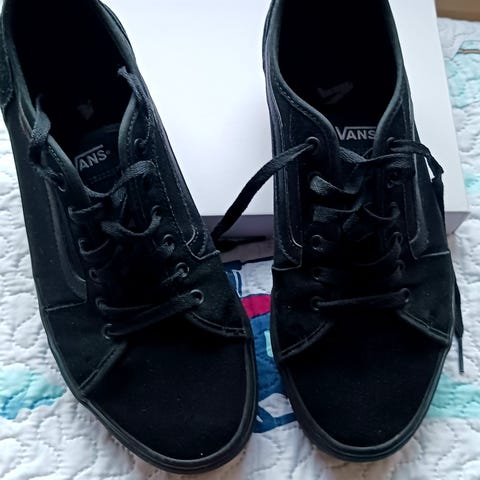 Hyvässä kunnossa olevat tummansiniset Vansin kengät.