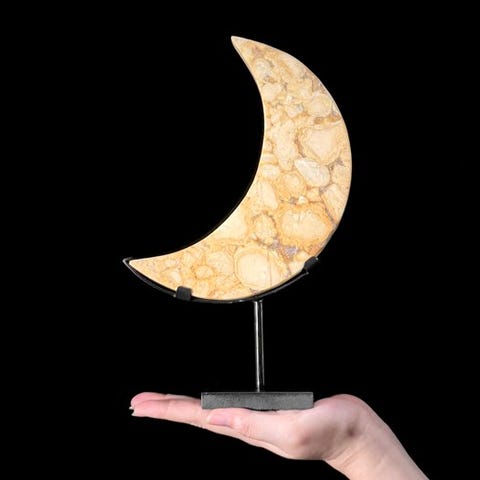 Kaunis kiillottu kuu, joka on tehty keltaisesta maligano jasperista, kustomoidulla jalustalla.