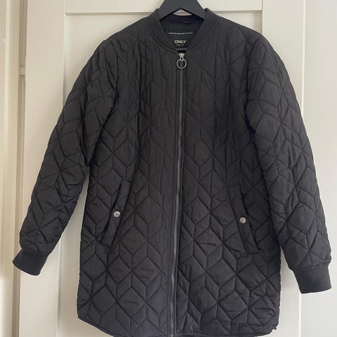 Onlyn musta muhkea toppatakki. Uusi, laput paikoillaan. Vetoketju (metallinen), ja neppari kiinnitys, iso huppu, isot taskut nepparilla, mahtuu isompikin kännykkä. Koko pituus 85 cm, k-k 52. Koko L. Postitus ok.