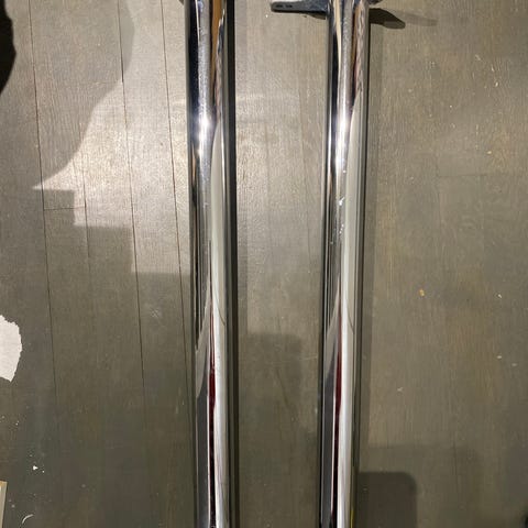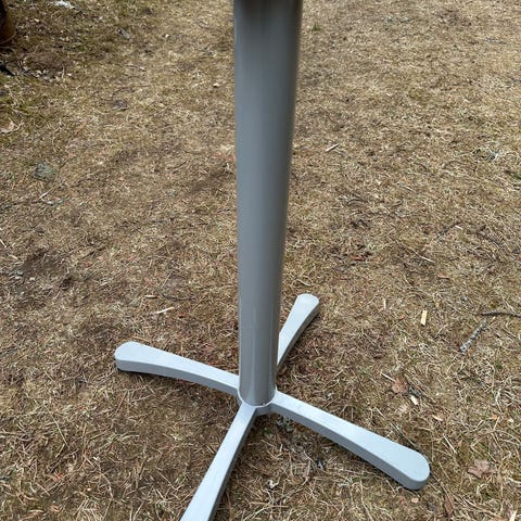 Kaksi leveää ja erittäin tukevaa metallista pöydänjalkaa, korkeus 68 cm. Vankka kiinnitys. Yhteensä 10 e.