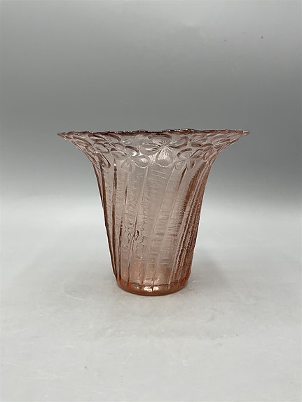 Maljakko, jossa on aaltoileva reuna ja monivärinen pohja. Maljakko on kirkasta lasia, ja siinä on monivärisiä yksityiskohtia.