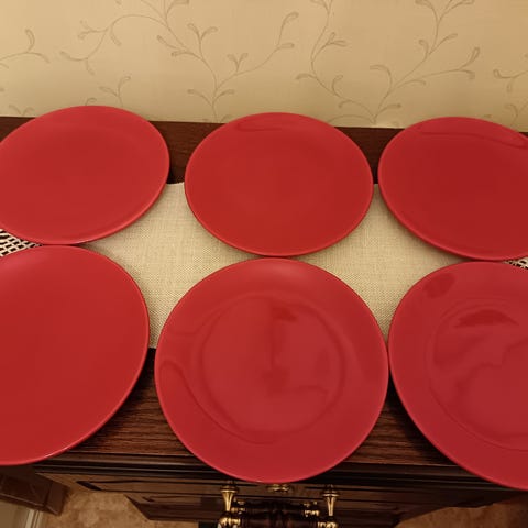 Myydään hyvässä kunnossa olevat vaalean punaset kakku lautaset 6kpl. 10e