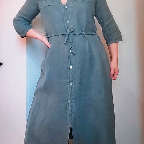 Tyylikäs ja monikäyttöinen kauniin vaaleansininen pellavamekko. Helma on hieman kevenevä. Voi käyttää takkina tai mekkona. Kaunis leikkaus. Hihat voi kääriä napin avulla. Edessä kaunis napitus. Hyvä kunto, käytetty jonkin verran. Koko noin L, kai-kai noin 55cm. Kuvassa 40-kokoisen yllä ja on sopiva. Merkki Made in Italy.