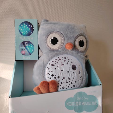 Hyväkuntoinen pöllö lelu /yövalo. Soittaa rauhallista musiikkia ja vaihtaa väriä. Toimii paristolla (paristot mukana). Nouto tai postitus.