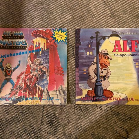 Kokoelma lastenkirjoja, jotka sisältävät erilaisia aiheita ja hahmoja, kuten dinosauruksia, nalleja ja satuja. T-Rex kirjassa kurkistus luukku jossa dinosauruksen eri osista kerrontaa.
