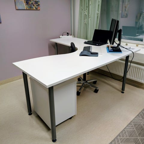 Työpöytä ja toimistotuoli valkoinen ja musta