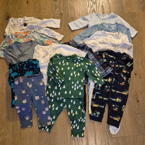 Merkkejä mm. Name it, H&M, Tutta, Ruskovilla. Vaatteet ovat käytettyjä ja ok-kuntoisia. Harmaaraidallisissa housuissa on hyvin pieni reikä. Osassa on pinnalla hieman pesunukkaa. Pesty hajusteettomalla pesuaineella. Tupakoimaton ja lemmikitön talous.