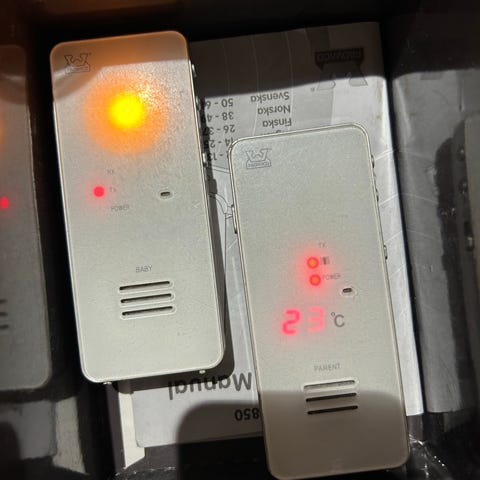 Hyväkuntoinen langaton itkuhälytin ja yövalo hämäräkytkimellä. Mukana latausjohto sekä ohjekirja.