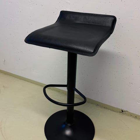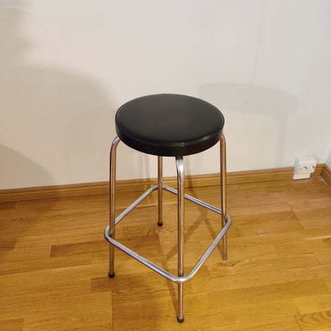 Baarijakkara metallijaloilla, tukevarakenteinen, musta istuin, halkaisija 32cm, korkeus 68cm.