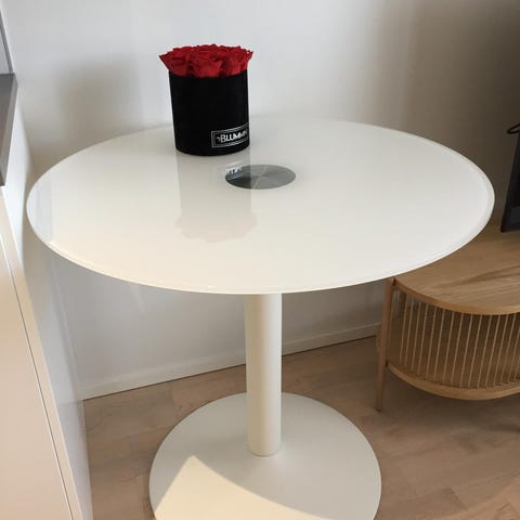 Minimalistinen muotoilu ja tukeva keskijalka tekevät pöydästä näyttävän mutta kevyen näköisen