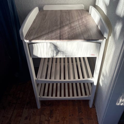 Troll lastenhuoneen hoitopöytä harmaalla viimeistelyllä. Hoitopöytä sisältää pehmustetun hoitoalustan ja useita hyllyjä säilytystilaa varten. Sopii lastenhoitoon ja vaatteiden säilytykseen. Pientä kulumaa.
