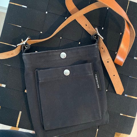 Marimekko Kangas olkalaukku unisex-käyttöön. Laukussa on musta kangasmateriaali, vetoketjullinen ulkotasku ja läppä, jossa on magneettikiinnitys. Laukussa on säädettävä olkahihna. Laukun sisätiloissa on tilaa henkilökohtaisille tavaroille. Laukussa on käytön jälkiä, kuten kulumaa kulmissa.