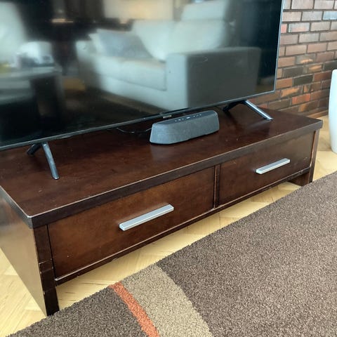Laadukas tamminen tv-taso. Tasossa muutamia jälkiä jotka näkyvät kuvassa.