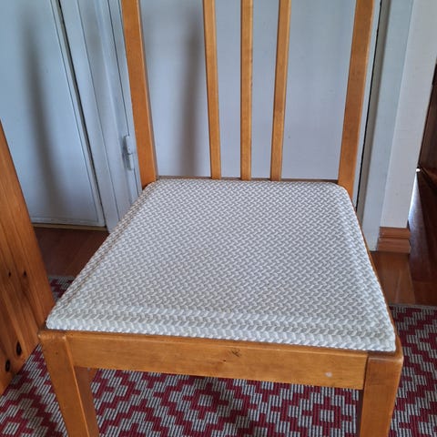 Puusepän tekemä tuoli 1950-luvulta, ehjä, ei natise tai heilu. Runko ollut tarkoitus entisöidä, eli maalit pois ja petsaus. Istuintyyny irrotettava. Sen runko koknaan uusittu ja tehty valmiiksi kankaan kiinnitystä varten. (Kangas ei sisälly kauppaan.)