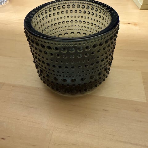 Iittala Kastehelmi koriste-esine, valmistettu sinisestä lasista. Esineessä on kohokuvioitu helmiäismäinen pintakuviointi, joka lisää sen visuaalista ilmettä. Sopii sisustuselementiksi tai koristeeksi erilaisiin tiloihin.
