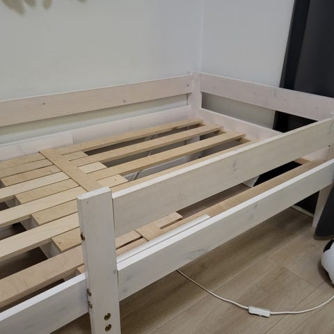 Vanha valkoiseksi maalattu, kahdesta osasta koostuva jatkettava sänky, joka pisimmillään 170 cm ja lyhimmillään 125 cm pitkä. Leveys n. 70 cm. Nämä siis patjan mitat. Kokonaispituudet 176 cm ja 132 cm ja leveys 75 cm. Päädyn korkeudet 115 cm ja 81 cm.