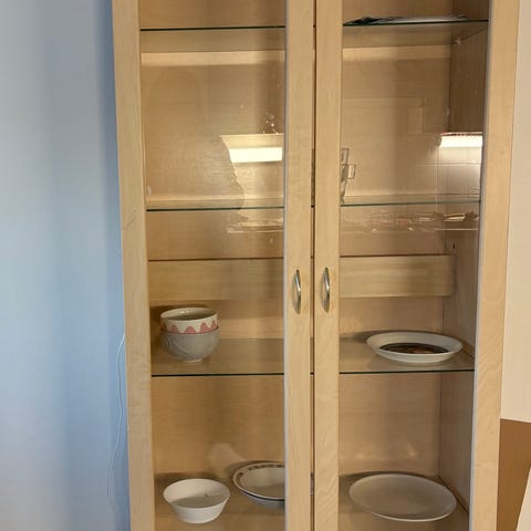 Kokonaisuudessa umpikaappi, vitriinikaappi, avohylly ja kolme vetolaatikkoa
