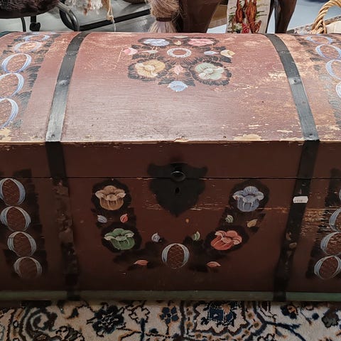 Antiikkinen arkku, entisöity vuonna 1970. Koko: 86-54-45cm. Rolf Schilbergin käsinmaalattu puinen arkku. Arkussa on koristeelliset maalaukset kannessa ja sisäpuolella. Arkku on varustettu metallisilla saranoin ja lukolla. Sisätilat sisältävät useita osastoja säilytystä varten.