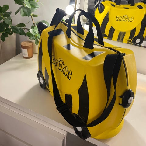Trukki-merkkinen lasten matkalaukku. Vetohihna puuttuu. Renkaat rullaavat hyvin. Puhdistus jää ostajalle.