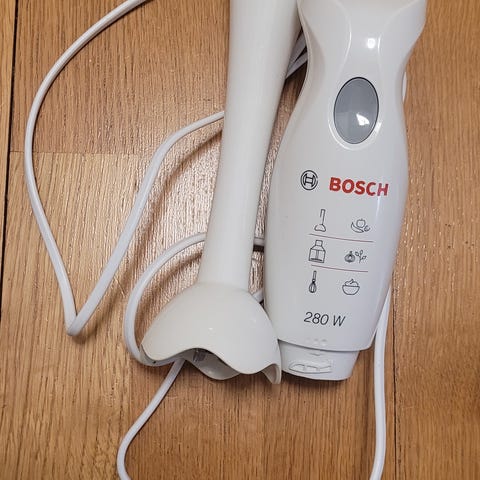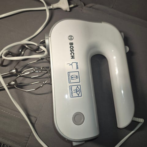 Bosch 375W sähkövatkain, varustettu kahdella vatkaimen vispilällä ja kahdella taikinakoukun lisäosalla. Sähkövatkain on valkoinen ja sopii erilaisten taikinoiden ja seosten vatkaamiseen ja sekoittamiseen.