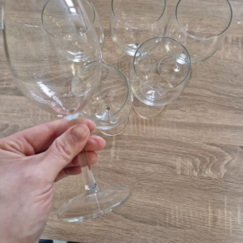 Annetaan neljä sinistä juomalasia. Laseja on paljon käytetty ja tarkkaan katsoessa näkyy naarmuja pinnalla. Kuitenkin täysin ehjiä.