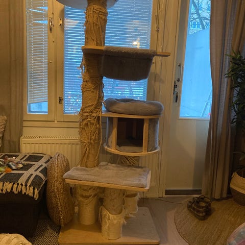 Kissan raapimispuu musta, jossa on useita tasoja ja köysiin käärittyjä raapimisalueita. Sopii kissojen leikkiin ja kynsien hoitoon. Mukaan saa muutaman märkruokapussin ja vähän kissaherkkua sekä raksupussin.