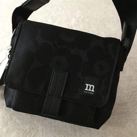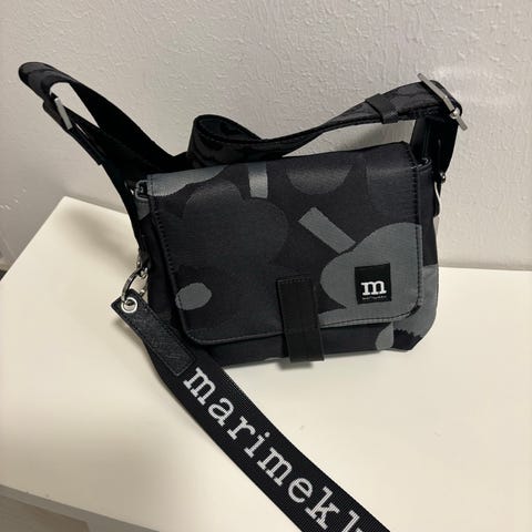Marimekko mini Messenger laukku säädettävällä olkahihnalla. Unikko kuosi, musta harmaa. Mukana Marimekko avaimenperä. Koko 17 cm 18 cm, syvyys 7 cm. Siistissä kunnossa.