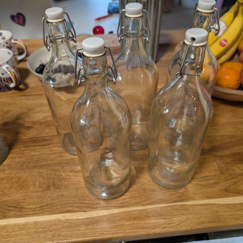 23 ikean patenttikorkkipulloa, pidetty hyvänä, pesty käytön jälkeen ja säilytetty sanomalehtikääreessä. Jos ostat vain yhden tai kaksi niin hinta saattaa olla korkeampi esim 2€ kpl koska vaiva tehdä muutaman euron kauppaa (silti halvempi kuin ikeassa) hinnat neuvoteltavissa, jos ostat enemmän voin hieman laskea hintaa.