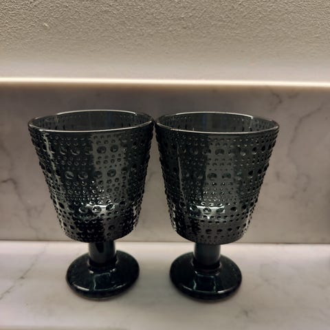 Iittala Kastehelmi juomalasi jalalla. Värinä pellava. Ei käytetty kertaakaan, joten ei mitään jälkiä. Hinta yhteensä 20€.