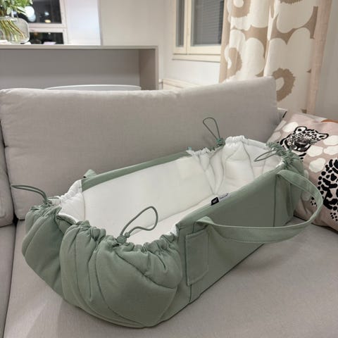 Tällä saa kätevästi vauvan kuljetettua huoneesta toiseen nukkuvana ja sopii vaunukoppaan, joten vauvaa ei tarvitse turhaan herättää uniltaan kun nappaa vain tämän kopasta mukaan.
