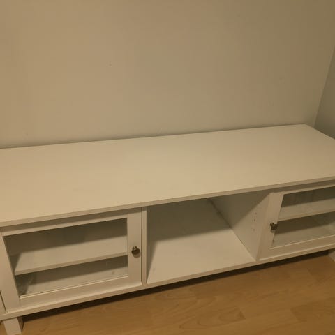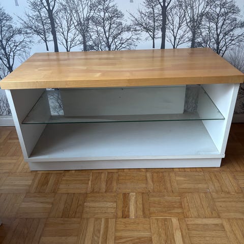 Vankka puinen TV taso. Käytön jälkiä näkyy. Mukaan hyllylevy (ei kiinnityksiä).