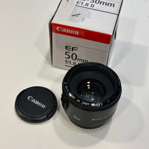 Kuvien mukainen 50 mm objektiivi, suojat molemmissa päissä
