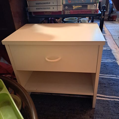 Mielestäni uutta vastaavassa kunnossa oleva valkoinen yöpöytä.