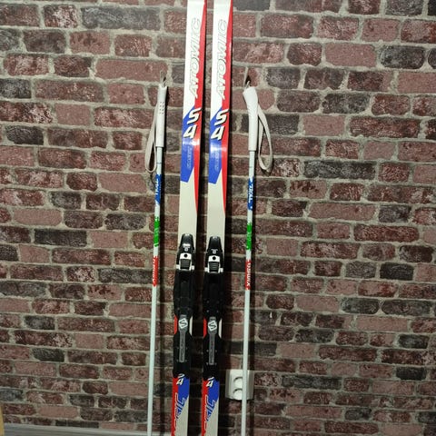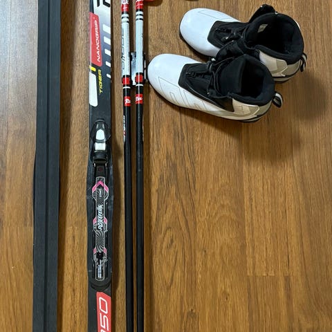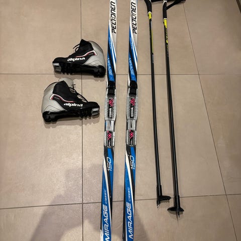 Madshus 140 cm karvapohjasukset, Swix 105 cm sauvat ja koon 32 Alpina monot.