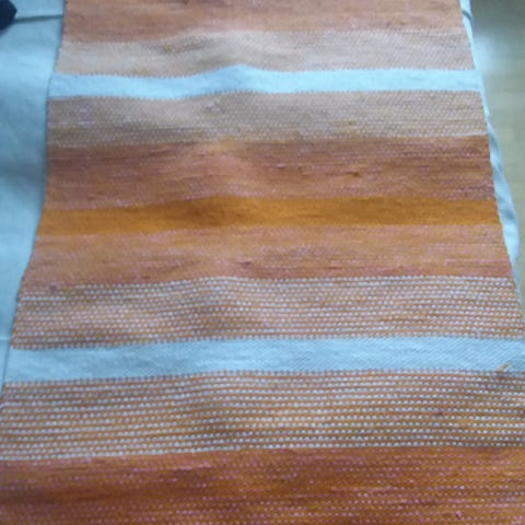 Uusi, pellavanväriseen loimeen kudottu perinteinen punasävyinen räsymatto. Kuteina ovat ostettu trikookude ja räsykuteet.