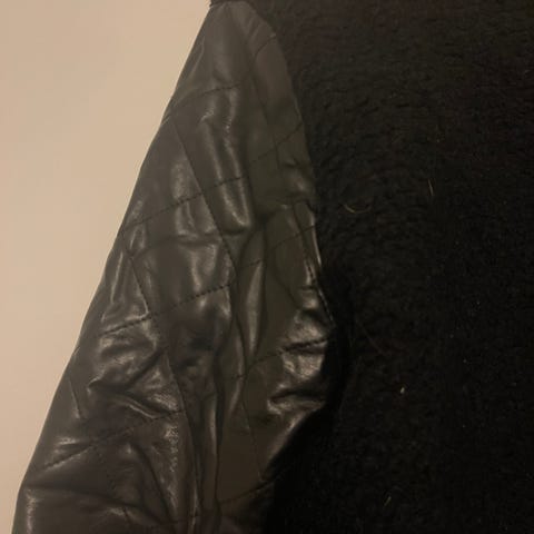 Harmaa villakangastakki nahkahihoilla,koko XL. Siistissä kunnossa. Hp.25€