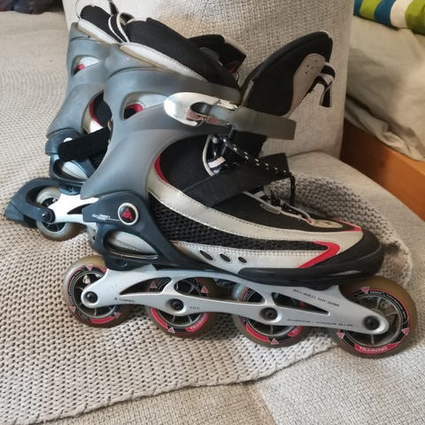 Hyvässä kunnossa olevat rullaluistimet. Kuvissa näkyy kunto. Mukaan saa pitkät sauvat. Itse 186cm, niin sauvat sopivat suht saman mittaiselle.