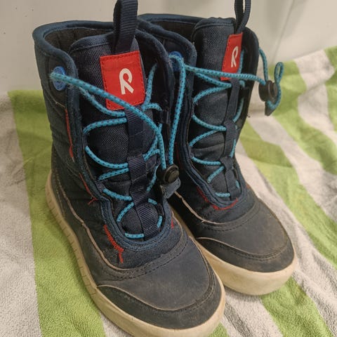 Reimatec-merkkiset lasten talvikengät. Tarrakiinnitys. Kärjessä olevat heijastimet hieman kuluneet, muuten oikein hyväkuntoiset.