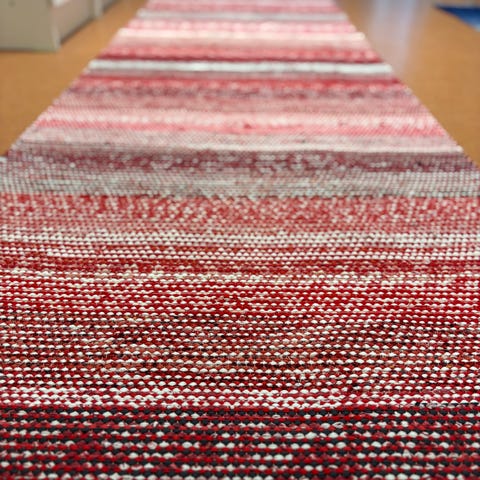 Uniikki, 50-60 lukua henkivä, perinteinen pellavan väriseen loimeen kudottu räsymatto.