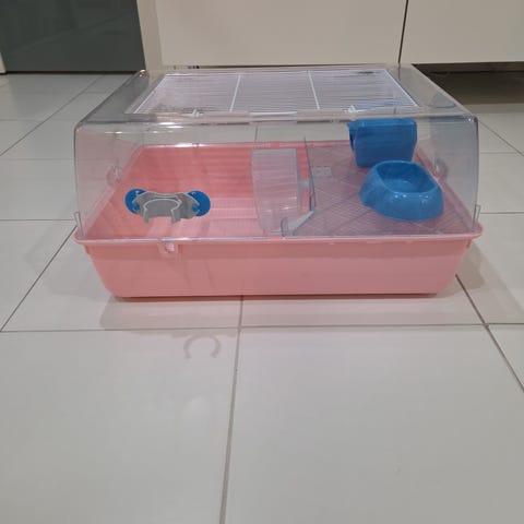 Hyväkuntoinen hamsterinhäkki. Juomapullon viereen on jyrsitty pieni reikä joka on paikattu. Pituus n.68cm leveys n.43cm ja korkeus n.31cm