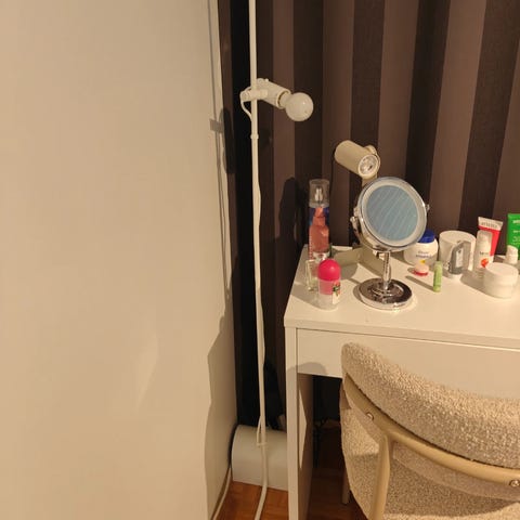 Lattiavalaisin, jossa on kolmijalkainen jalusta mustassa värissä. Valaisin on varustettu harmaalla varjostimella. Soveltuu kodin tai toimiston valaistukseen.