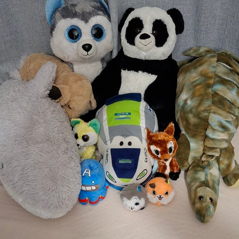 Osa enempi käytetty osa vähempi. Punainen lintu on tyyny, pinkkin pupun sisälle saa esim. Lämpöpussin.