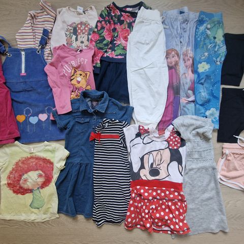 Yksittäisiä 104 ja 122 kokoisia, suurin osa 110/116. Osassa tahraa, pesuhaitua tmv, menee vaikka päiväkodissa tai mummulassa vielä vallan hyvin.