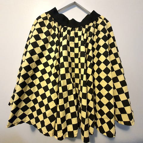 Kellohame, ommeltu laadukkaasta asustekankaasta, jossa kaunis samettipainatus. Sivulla vetoketju ja helmassa satiininauha. Helman pituus 60 cm ja vyötärön ympärys 70 cm.