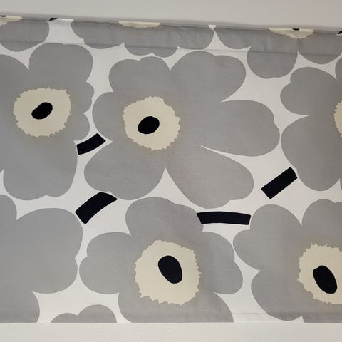 Marimekko unikko kankaasta ommeltu kappaverho. Valkaisematon puuvillakangas