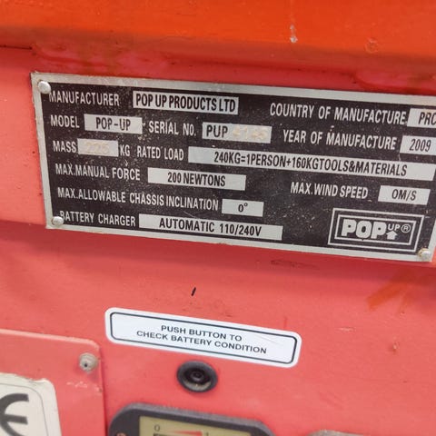 Karun näköinen, mutta ollut meillä usean vuoden ja ajanut asiansa, toiminut hyvin. Aika järeä, painaa arviolta n 2000kg. Hyvät Trojan akut (4 kpl 6v). Nostaa niin korkealle että huimaa. Koska alla on ilmakumirenkaat, lava huojuu, ja korkealle nostettaessa vaatisi tukijalat. Itse käytetty n 5 metrin työkorkeudelle ilman. Tiputtaa hieman ajomoottoreista, mutta meillä ei koskaan lisätty hydrauliöljyä. Kulkee hiekkapintaisella pihalla hyvin ees taas ja kääntyy. Ladattu erillisellä 24v laturilla, huom laturi ei tule mukaan.