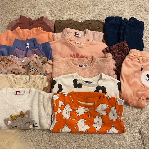 Lastenvaatepaketti kokoa 86-92. Eri kuntoista, ei priimaa, mutta käyttökelpoista. Suurimmat moitteet alla, en kuitenkaan syynää näitä. Koiratalous.