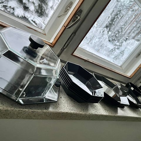 Reilun kokoiset 90-luvun lasiset kahvikupit asettien kera sekä iso tarjoilulautanen.