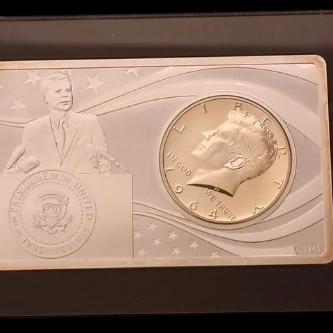 Kennedy hopea dollari 1964: Kennedy hopeadollari 1964 - yksi kaikkien aikojen klassikkodollareista. Kysytyn hopeadollarin nimellisarvo on 1/2 dollaria. Kolikon halkaisija: n. 29mm.